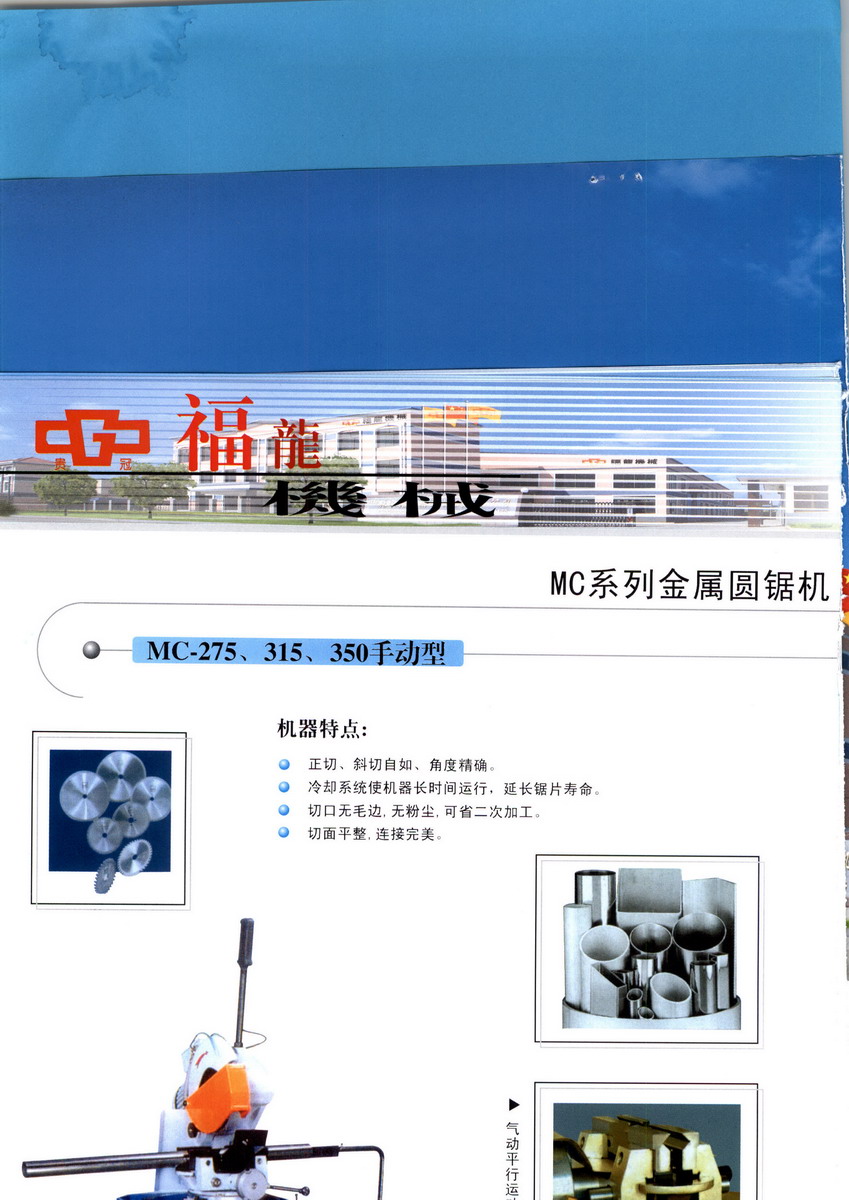公司生產(chǎn)的MC系列金屬圓鋸切管機、DW-NC系列單頭液壓彎管機、DW-SNC系列半自動數(shù)控三維立體彎管機、DW-CNC系列全自動數(shù)控三維立體彎管機、SW系列雙頭液壓彎管機、YW系列全自動壓彎機、DM系列錐度縮管機、PS系列全自動液壓縮管機等自動化管材加工機械被廣泛應(yīng)用于汽車配件(剎車油管、保險杠、消音器、座椅、車把手、機車車架)、摩托車制造、自行車制造、童車制造、船舶造船、鋼制家具、休閑旅游用品、健身器材、空調(diào)配管、石油化工、鍋爐制造、衛(wèi)浴設(shè)備、不銹鋼裝飾、制管等行業(yè),是各種管材、型材進行無毛刺切割、高精度彎曲、管端成型加工的理想設(shè)備。