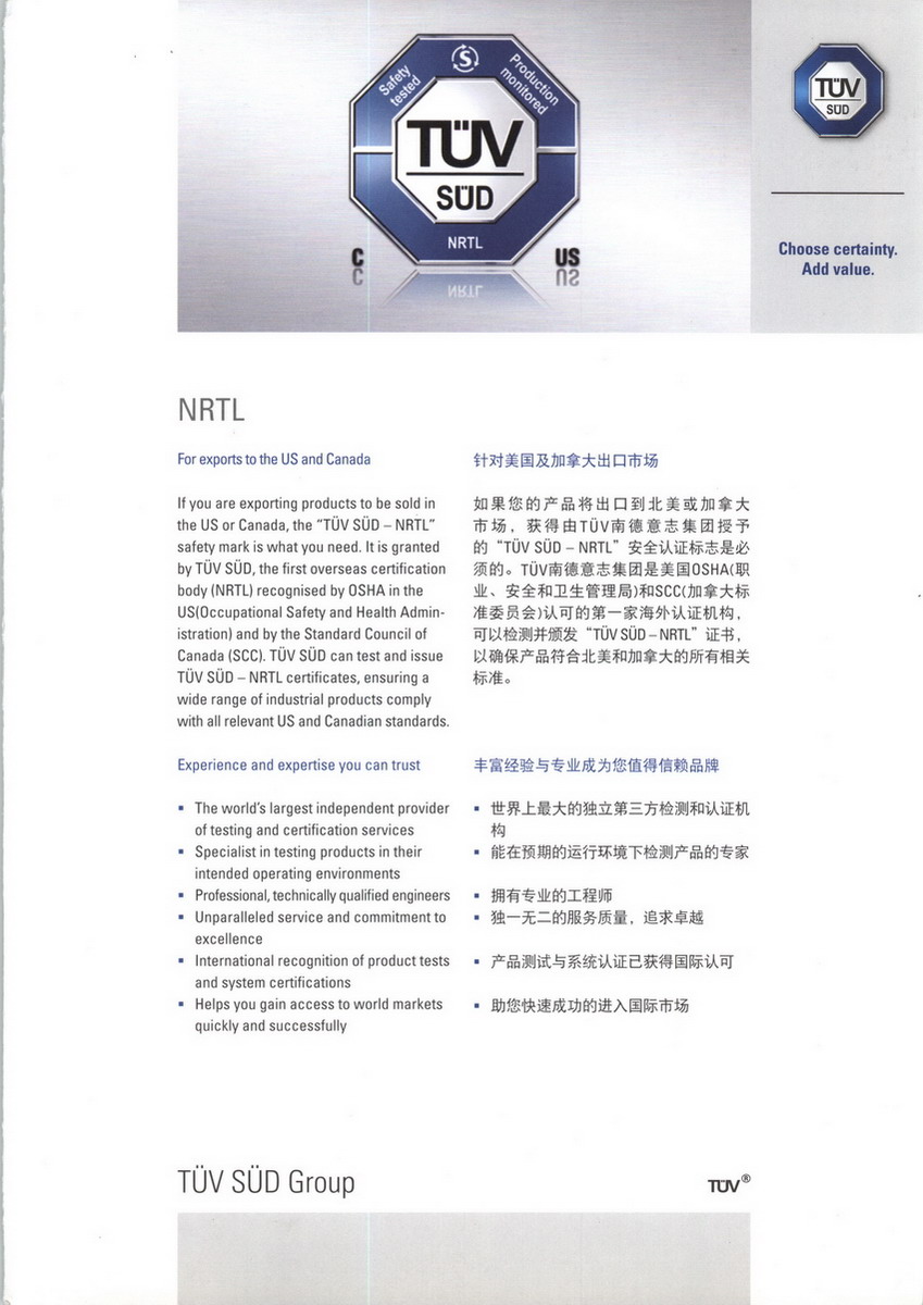 TUV SUD Group China德國TUV南德集團(tuán)北京分公司 TüV 南德意志集團(tuán)TüV SüD 140年前誕生于德國, TüV南德意志集團(tuán)是業(yè)內(nèi)領(lǐng)先的技術(shù)服務(wù)公司,為您提供資訊,檢驗(yàn),測試,專家意見,認(rèn)證和培訓(xùn)服務(wù)。14,000多名員工遍及全球600多個辦事處,著力為您實(shí)現(xiàn)技術(shù)、體系和實(shí)際運(yùn)作中的優(yōu)化服務(wù)。 我們提供的產(chǎn)品服務(wù)包括:CE認(rèn)證/GS認(rèn)證/TüV認(rèn)證/CB認(rèn)證/船檢/驗(yàn)貨/化學(xué)測試/環(huán)境試驗(yàn)/性能安全等 產(chǎn)品涉及范圍:工程機(jī)械、新能源(光伏、風(fēng)能)、電氣設(shè)備、工業(yè)設(shè)備、零部件、壓力容器、醫(yī)療設(shè)備等 最新情況和數(shù)據(jù) “權(quán)威認(rèn)證,創(chuàng)享價值”是TüV南德意志集團(tuán)向客戶提供服務(wù)的核心理念。我們是您忠誠盡職的流程伙伴,擁有值得驕傲的完整行業(yè)知識。我們的認(rèn)證專家和專業(yè)技術(shù)人員向客戶提供貫穿整個價值鏈的服務(wù),并著重于知識服務(wù)、測試、認(rèn)證和培訓(xùn)等核心競爭業(yè)務(wù)。 2008年,TüV南德意志集團(tuán)的總營業(yè)額增加到14億歐元。 我們的背景 從致力于降低技術(shù)風(fēng)險的技術(shù)監(jiān)督協(xié)會發(fā)展成業(yè)內(nèi)領(lǐng)先的全球服務(wù)公司。 140年前,由鍋爐操作人員在德國的巴登符騰堡州,巴伐利亞州,黑森州和薩克森州等工業(yè)心臟地區(qū)建立了這一私人行業(yè)性協(xié)調(diào)團(tuán)體,其商業(yè)宗旨為“保護(hù)人類,環(huán)境和財產(chǎn),防止技術(shù)的消極影響”,這就是TüV南德意志集團(tuán)的前身 隨著技術(shù)的進(jìn)步,我們的經(jīng)營范圍也在逐漸擴(kuò)大(比如電力、汽車、防火安全設(shè)施、發(fā)電廠工程、載人電梯、索道、核電站、環(huán)境保護(hù)、產(chǎn)品安全、管理體系等)。 我們的服務(wù)涉及如機(jī)械安全、電子電器消費(fèi)產(chǎn)品、化學(xué)測試等方面、為您提供全面的一站式服務(wù),如測試、檢驗(yàn)、認(rèn)證、培訓(xùn)服務(wù)和知識服務(wù)。 我們的方案,萬無一失。 相伴于您企業(yè)運(yùn)作的整個過程之中,為您提供測試、檢驗(yàn)、認(rèn)證和培訓(xùn)等方案,確保您效益、安全和質(zhì)量的最大化。 產(chǎn)品服務(wù)范圍 機(jī)械安全 南德意志集團(tuán)幫助您完善產(chǎn)品,滿足CE與德國GS安全認(rèn)證要求。 電子和電氣消費(fèi)品服務(wù) 確保您的產(chǎn)品滿足CE、GS、EMC等認(rèn)證要求,幫助您迅速進(jìn)入目標(biāo)國際市場 化學(xué)測試 從RoHS、WEEE、REACH指令測試到PAHs等各類有毒有害物質(zhì)檢測,我們的化學(xué)部門測試服務(wù)涵蓋所有電子電器設(shè)備及各類日常消費(fèi)品。 燃?xì)忸惍a(chǎn)品 EC 標(biāo)識、初期產(chǎn)品檢驗(yàn)、EN 484 玩具產(chǎn)品 TüV 南德意志集團(tuán)-玩具價值鏈的守護(hù)者 紡織品(服裝,鞋類) 為您量身訂做靈活的解決方案,使您的產(chǎn)品更具競爭力 汽車服務(wù) 從整車到零部件測試,從認(rèn)證到工程服務(wù),TüV 南德意志集團(tuán)運(yùn)用專業(yè)知識協(xié)助汽車和零部件生產(chǎn)商,出口到新興市場。 承壓設(shè)備和材料 TüV 南德意志集團(tuán)是您在蒸汽及壓力技術(shù)、焊接及材料等領(lǐng)域的最佳合作伙伴。 化工,石化和制藥行業(yè)裝備 我們提供一站式定制的技術(shù)服務(wù),涉及到裝置全過程的每個步驟。 醫(yī)療器械 從醫(yī)療器械檢測服務(wù)到體系及產(chǎn)品認(rèn)證,TüV 南德意志集團(tuán)以專業(yè)快捷有效的服務(wù),為您打開全球醫(yī)療器械市場之門。 包裝,環(huán)境,可靠性 振動測試,沖擊測試,跌落測試,失效分析等。 食品分析/微生物 食品/化妝品重金屬測試,食品級包裝材料測試,醫(yī)療器械無菌驗(yàn)證等。 太陽能產(chǎn)品 PV產(chǎn)品的測試、認(rèn)證等。 風(fēng)力發(fā)電 風(fēng)場評估,風(fēng)機(jī)認(rèn)證,風(fēng)電場定期檢驗(yàn)等。