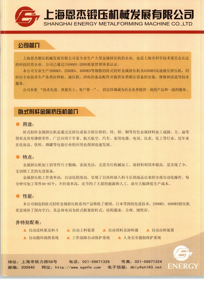 上海恩杰鍛壓機械發(fā)展有限公司是專業(yè)生產(chǎn)大型臥式金屬擠壓機的企業(yè)。也是上海市科學(xué)技術(shù)委員會認(rèn)定的科技經(jīng)營企業(yè)。本公司專業(yè)生產(chǎn)2000KN、2500KN、4000KN等規(guī)格的臥式肘桿金屬擠壓機。同時以專業(yè)技術(shù)生產(chǎn)各類拉伸機、液壓機、沖床的備品配件并提供各類鍛壓設(shè)備的安裝、維修和改造等技術(shù)服務(wù)。公司本著 “技術(shù)先進、質(zhì)量至上、客戶。” 的宗旨竭誠為社會各界提供一流的產(chǎn)品和一流的服務(wù)。