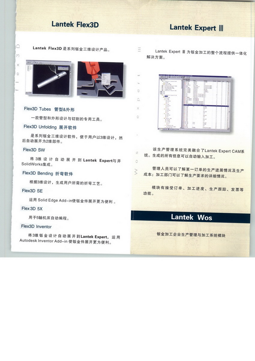 西班牙Lantek公司是鈑金行業(yè)軟件供應(yīng)商,其產(chǎn)品線包括CAD/CAM/PDM/ CRM/ERP。鈑金的解決方案包括沖、切、折、復(fù)合機(jī)床編程,三維部件設(shè)計(jì)和展開,管料和表面切割,折彎編程等。Lantek 范圍內(nèi)和主要廠商長(zhǎng)期合作,其中包括LVD、Euromac、Hankwang等。為方便客戶,我們與主流CAD軟件供應(yīng)商合作,包括SolidEdge、SolidWorks、Inventor等。 Lantek成立于1986年,經(jīng)過(guò)20多年的不斷努力: 銷售額及市場(chǎng)占有率歐洲** 研發(fā)人員及軟件升級(jí)研發(fā)投入業(yè)14個(gè)國(guó)家擁有分公司 支持16 種語(yǔ)言 五大洲約有7000家客戶,包括EROMAC、LVD、西門子、豐田、韓光,大連機(jī)床廠等 為更好地服務(wù)中國(guó)區(qū)用戶,Lantek 在2006年成立中國(guó)分公司,目前在廣州和上海設(shè)有服務(wù)機(jī)構(gòu)。公司產(chǎn)品主要分為兩塊,CAD/CAM和鈑金工廠**ERP CAD部分分為二維設(shè)計(jì),三維設(shè)計(jì)/展開,空調(diào)風(fēng)管設(shè)計(jì)等 CAM軟件是一種通用CAM軟件,兼容上絕大多數(shù)的沖/切/復(fù)合設(shè)備。 ERP可以給用戶帶來(lái)生產(chǎn)排班,員工培訓(xùn),生產(chǎn)管理,減少重復(fù)勞動(dòng)等等便利。