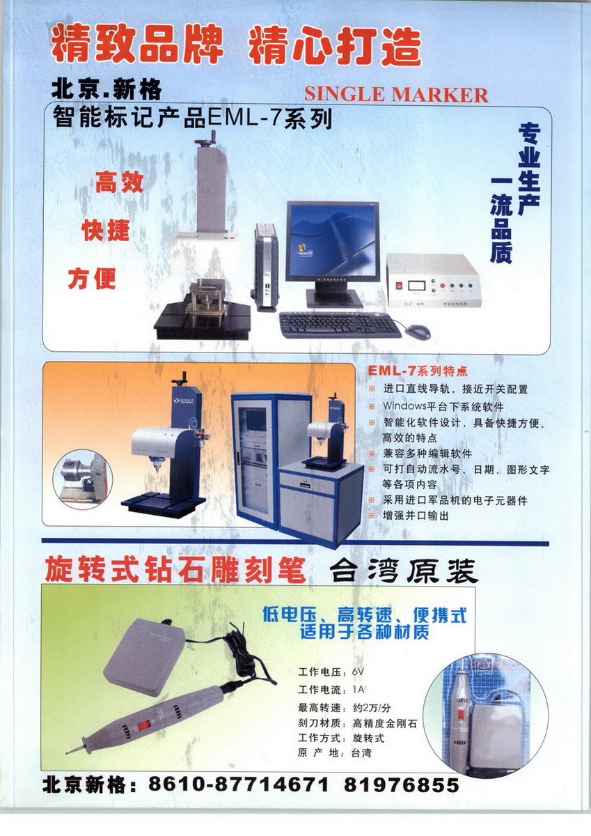 我公司位于繁華的北京市朝陽區(qū)的中心地帶。公司主要人員均長期專業(yè)從事打標機行業(yè)工作,同時聘請臺灣高級專業(yè)技術(shù)顧問,他們有著豐富的實踐經(jīng)驗與精湛的專業(yè)技術(shù)知識。長期致力于各類標識機械的研究與開發(fā)等系列工作,使得新格永發(fā)公司始終站在行業(yè)的前列,始終保持著先進科學(xué)的積極響應(yīng)者的姿態(tài),不斷地在成長中更新和發(fā)展自己;“新格”牌系列產(chǎn)品博眾家之長,創(chuàng)獨家之特色,始終保持著獨特的經(jīng)營模式與設(shè)計能力,以綠色環(huán)保為理念,將先進性、科學(xué)性、實用性融為一體,不斷地推陳出新,為廣大客戶研制出了更多的質(zhì)優(yōu)價廉的綠色環(huán)保、無噪聲高科技產(chǎn)品,以滿足更多的客戶需要。客戶是上帝,質(zhì)量是生命,服務(wù)是靈魂,是我們永遠信奉的格言,同時也是我們新格公司每一位員工一切行動的宗旨。我們將以我們的真誠信用回報每一位客戶,保證他們實現(xiàn)最大的利益與回報,希望通過我們的產(chǎn)品和我們的服務(wù),能感受到新格的真誠奉獻,希望更多的客戶能夠由此而得到更多的收益。我公司生產(chǎn)銷售各型號打標產(chǎn)品及臺灣原產(chǎn)氣動工具,包括:新格牌半導(dǎo)體激光打標機,新格二氧化碳激光打標機,新格氣動打標機,新格金屬電化打標機、銘牌刻字機、壓字機,流水線專用號碼機,沖床專用號碼機,臺灣原裝進口攻絲機,臺灣原裝進口氣動攻絲馬達,懸臂式支架,國產(chǎn)電動刻字筆,原裝進口電刻筆、WE251型可調(diào)速度電動雕刻筆,氣動起子,氣動扳手、臺灣原產(chǎn)氣動刻字筆,原裝進口修磨工具、工業(yè)級刀具研磨機,銑刀研磨機,鉆頭研磨機,側(cè)刃研磨機,球刀研磨機,各類扭力工具,扭力起子,扭力測試儀,扭力計,推拉力計,推拉力測試儀,張力計,氣動剪刀頭,氣動剪,專業(yè)定做各類不銹鋼,銅,鋁腐蝕銘牌,激光打標加工,氣動標記加工等各類產(chǎn)品,歡迎各類新老客戶來電來信詢洽。
