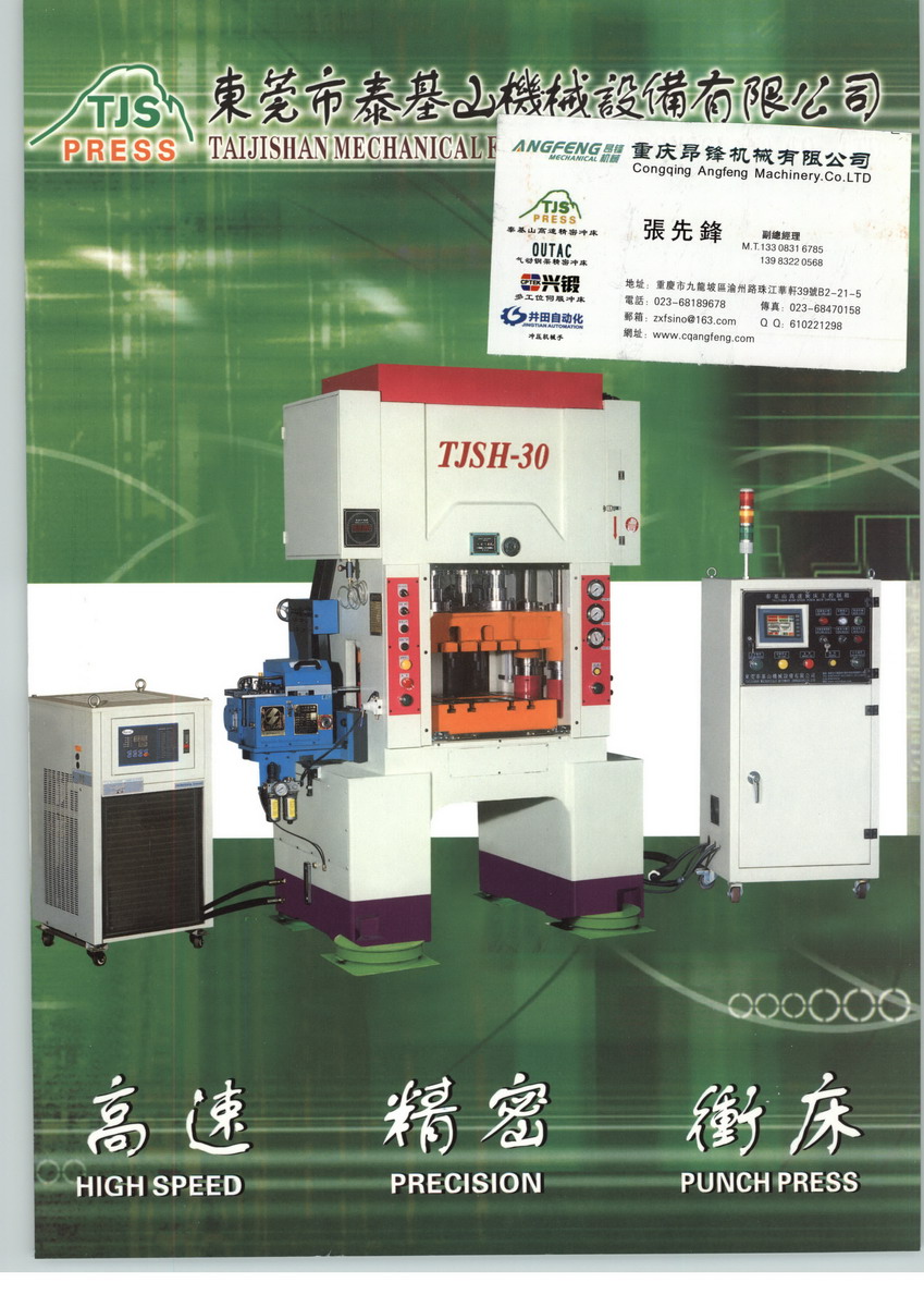 Taijishan Mechanical Equipment (Dongguan) Company boasts more than twenty years' productionexperience of making professional high-speed punch presses with precise guild pillar. The company'sR&D Department has gathered a galaxy of elites in this field, which guarantees its technical prowess.Besides, the complete inspection facilities and prudent, normative quality management system furthercontribute to the superb quality and glory of the corporation.The company sticks to the operation policy of "honesty as cornerstone, double-win and mutual benefits"and has won popularity among customers far and wide. The company has sale s bases in many countries, such as Thailand and Vietnam, etc.We follow the tenet of "continuous improvement and commitment to perfection" and hold the conceptof "customers first and quality foremost". With devotion and advanced technologies, we provide high qualityservice for all our customers.
