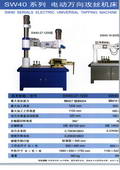 本公司是生產電動萬向攻絲機床的,產品用途廣泛,能對鋼、鑄鐵、鋁、銅等各種材料進行攻絲,適用于各類機械加工制造行業(yè)。工作效率高,一天可完成手工50天的工作量;靈活性強,可實現萬向攻絲,垂直、水平、側向,360度均能攻絲;動力裝置及絲錐夾筒帶雙重保護確保不會損壞絲錐,同時攻絲過程承受力均衡,螺牙加工精度高。大機型:SW40-27-1200范圍在M4-M34,小機型:SW40-16-800范圍在M4-M20