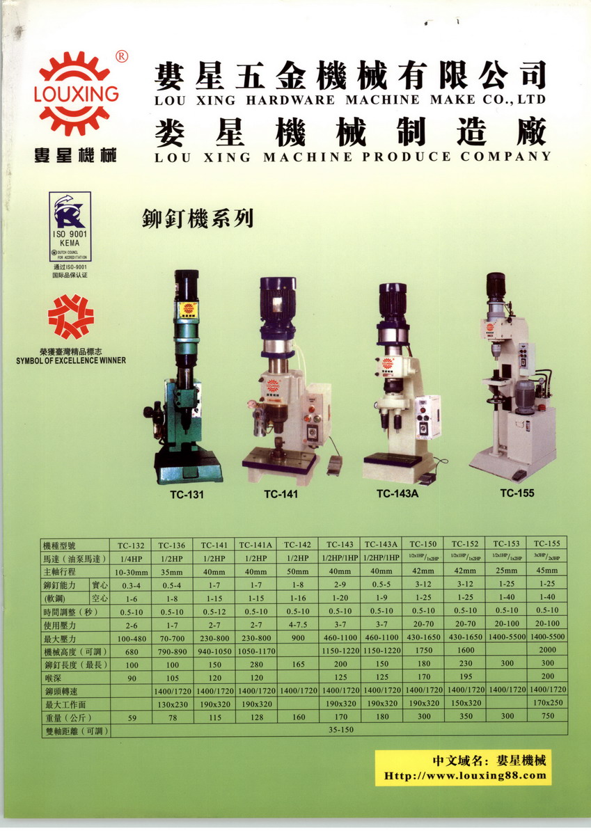 東莞市婁星五金機(jī)械有限公司,臺(tái)灣成立于1976年;大陸東莞成立于2000年;江蘇昆山成立于2003年。是集設(shè)計(jì),開(kāi)發(fā),制造,銷售于一體的機(jī)械生產(chǎn)廠家。并以引進(jìn)日本、臺(tái)灣等先進(jìn)技術(shù)及電子元件,開(kāi)發(fā)及制造:攻牙機(jī)、鉚釘機(jī)、鉆孔機(jī)、刀具設(shè)定儀、齒輪式攻牙機(jī)、多軸鉆孔攻牙器、空油壓鉚釘機(jī)、撞釘機(jī)、高速鉆孔機(jī)、磁性鉆孔攻牙機(jī)、非標(biāo)專用機(jī)械、沖床周邊機(jī)械設(shè)備等。所生產(chǎn)的機(jī)械廣泛適用于汽車、摩托車、單車、壓鑄、五金、電子、燈飾、運(yùn)動(dòng)器材、沙灘椅、燒烤爐等行業(yè)。配合生產(chǎn)的實(shí)心釘,中空釘品種齊全, 品質(zhì)保證。深受廣大用戶好評(píng),產(chǎn)品廣銷日本、臺(tái)灣、東南亞及國(guó)內(nèi)各??!
