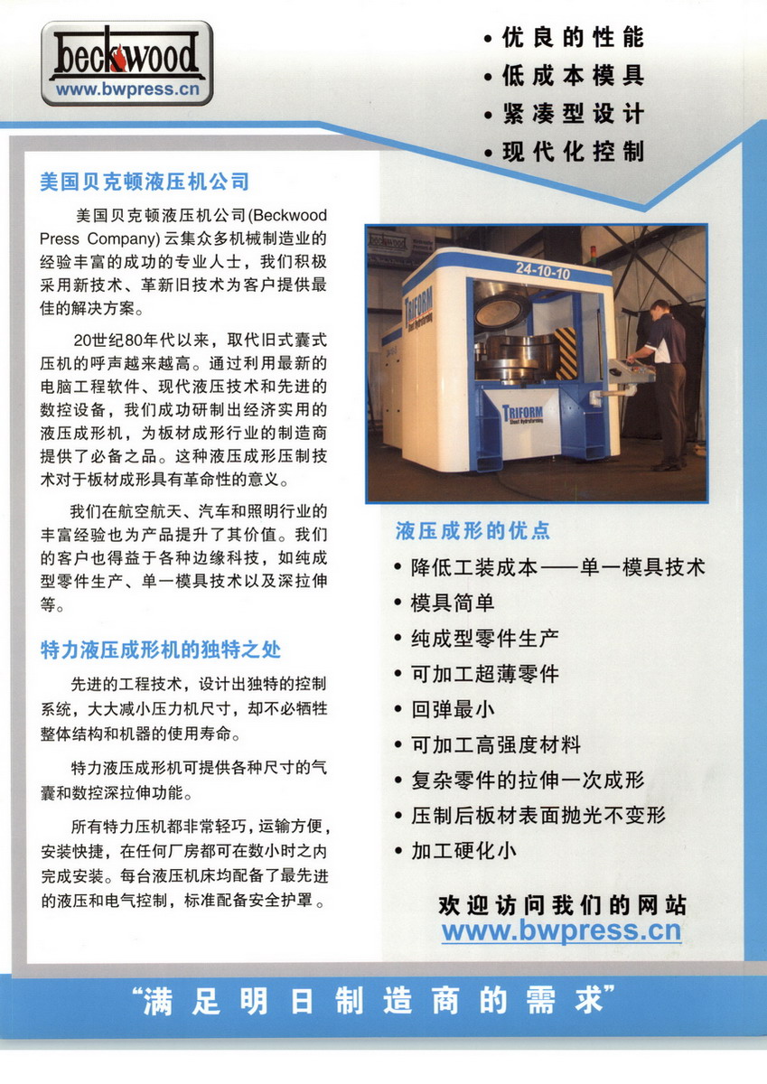 美國(guó)貝克頓液壓機(jī)公司云集眾多機(jī)械制造業(yè)的經(jīng)驗(yàn)豐富的成功人士,我們積極采用新技術(shù)、革新舊技術(shù)為客戶提供最佳的選擇方案。