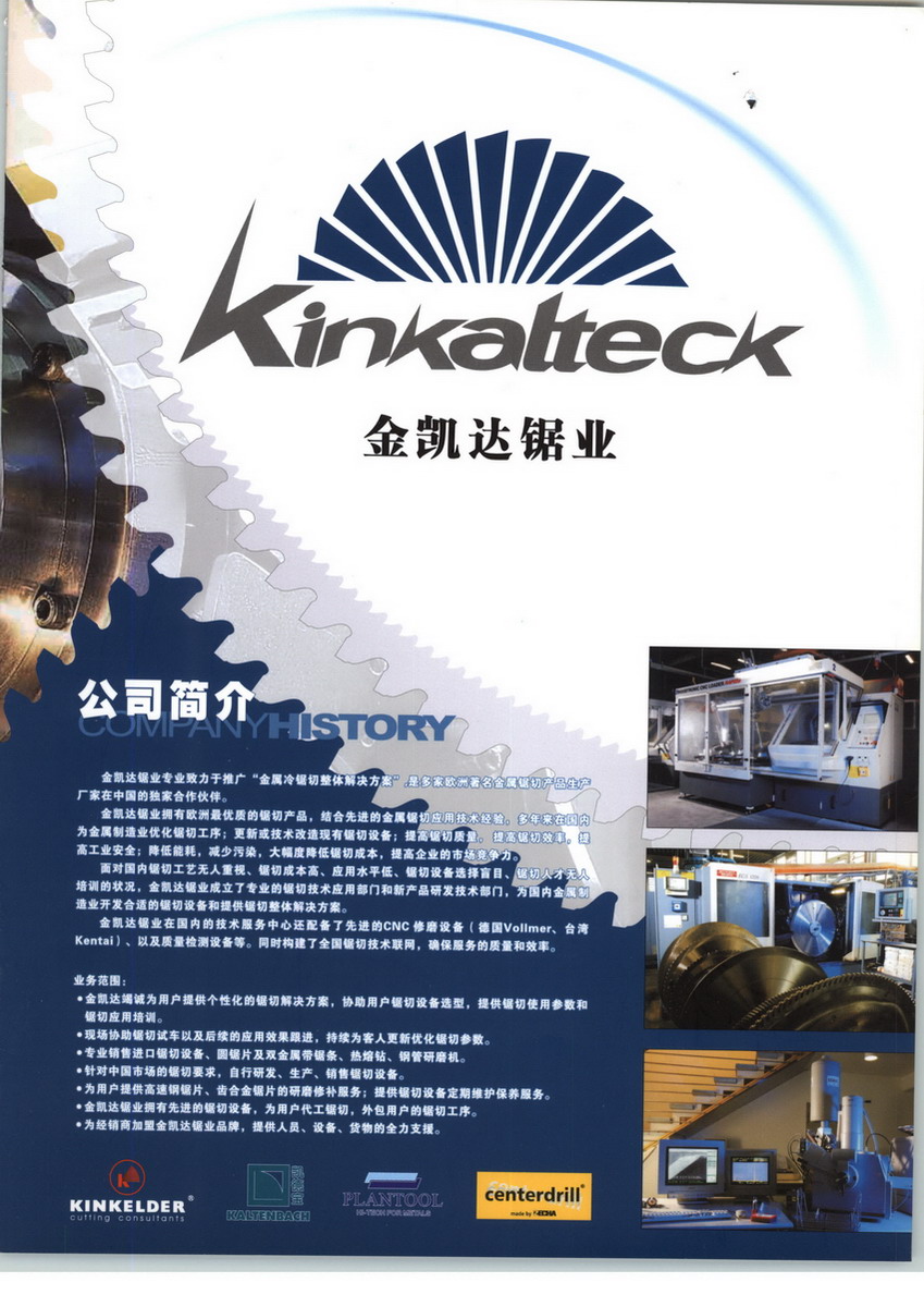 金凱達(dá)鋸業(yè)(KINKALTECK) 是一家專業(yè)致力于推廣“金屬冷鋸切成套設(shè)備解決方案”的服務(wù)型企業(yè)。代理國(guó)外著名金屬鋸切設(shè)備,鋼管鋼棒加工機(jī)械和金屬切割產(chǎn)品;經(jīng)營(yíng)進(jìn)口金屬圓鋸片、不銹鋼鋸片、高速鋼圓鋸片、雙金屬帶鋸條、高速圓鋸機(jī)、圓盤鋸、切管機(jī)、研磨機(jī)、拋光機(jī)、熱鉆、切鋁機(jī)、切斷機(jī)、磨齒機(jī)、帶鋸機(jī)、鋸床等,并提供鋸切設(shè)備維護(hù)及金屬切割技術(shù)咨詢服務(wù)。
