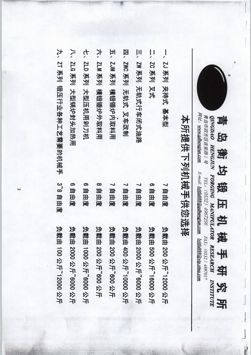 本所研制的六大系列裝出料機(jī)械手,遍布全國各地,得到用戶的一致好評(píng),其關(guān)鍵技術(shù)是上世紀(jì)90年代初我所研制的無絞軸夾頭,其特點(diǎn)是:具有體積小,夾持力大和在高溫爐內(nèi)有較長耐熱時(shí)間等多項(xiàng)優(yōu)點(diǎn)。本系列裝取料機(jī)械手是在我國鍛壓行業(yè)中獨(dú)立發(fā)展起來的專業(yè)性很強(qiáng)的產(chǎn)品,懸臂長度可設(shè)計(jì)在4m-5m之間,這對(duì)鍛壓機(jī)與裝出料機(jī)械手的布置很易進(jìn)行,司機(jī)可遠(yuǎn)離熱源。經(jīng)30多年來的現(xiàn)場(chǎng)使用證明,裝出料性能皆可滿足眾多鍛造廠家。