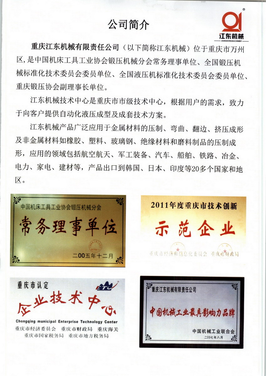 重慶江東機(jī)械有限責(zé)任公司(以下簡(jiǎn)稱為江東機(jī)械)通過七十年的發(fā)展,已經(jīng)成為中國(guó)西部規(guī)模最大、綜合實(shí)力最強(qiáng)的專業(yè)液壓成形設(shè)備制造企業(yè)。 公司占地458畝,總資產(chǎn)超過3億元,擁有現(xiàn)代化標(biāo)準(zhǔn)廠房7萬余平方米,員工1000余人,擁有各類專業(yè)技術(shù)人員150余人,其中國(guó)家級(jí)專家2人、市級(jí)專家4名、高級(jí)工程師6名;在機(jī)械設(shè)計(jì)方面擁有國(guó)家級(jí)專家1名,市級(jí)專家1名,高級(jí)工程師2名;在液壓設(shè)計(jì)方面擁有國(guó)家級(jí)專家1名,市級(jí)專家1名,高級(jí)工程師2名;電氣設(shè)計(jì)方面擁有市級(jí)專家2名,高級(jí)工程師2名;另外,江東機(jī)械擁有各類專業(yè)加工設(shè)備200余臺(tái)(套),完全具備為用戶提供5000KN-60000KN的各種大型、快速、精密、專用的全自動(dòng)液壓機(jī)及成套生產(chǎn)線的綜合實(shí)力,月平均制造能力達(dá)到100余臺(tái),年創(chuàng)產(chǎn)值能力達(dá)到4億元以上。