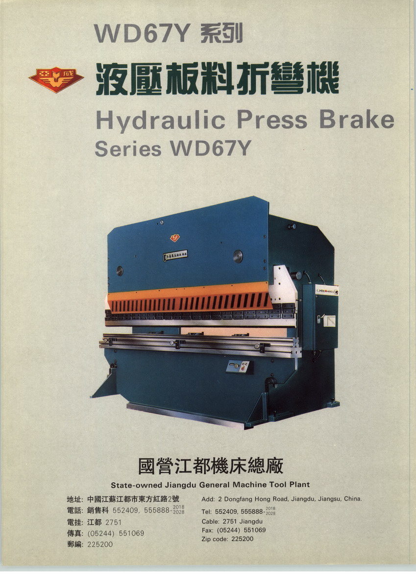 全國折灣機(jī)、剪板機(jī)產(chǎn)銷量最大的企業(yè)──江都機(jī)床總廠廠長袁以信創(chuàng)建于1956年的國營江都機(jī)床總廠,是機(jī)械工業(yè)部定點(diǎn)專業(yè)生產(chǎn)板料加工機(jī)械的省屬中型企業(yè),現(xiàn)有職工1000余名,專業(yè)技術(shù)人員205人,其中,具有高級(jí)職稱的10多人,中級(jí)職稱的40多人,占職工總數(shù)的20%以上。全廠占地面積近12萬平方米,廠房面積21700平方米,擁有固定資產(chǎn)原值3000多萬元,各類加工設(shè)備260余臺(tái),精大稀設(shè)備30臺(tái),機(jī)械加工設(shè)備和檢測(cè)手段完備。全廠現(xiàn)有六個(gè)生產(chǎn)車間和板焊、鑄鍛、熱處理、模具四個(gè)專業(yè)化分廠。廠辦機(jī)械研究所,具有產(chǎn)品開發(fā)設(shè)計(jì)能力,每年可自行開發(fā)新品2~3個(gè)?,F(xiàn)行主產(chǎn)品為:16t、25t、40t、63t、100t、160t、250t、400t8個(gè)品種的板料折彎機(jī)(有普遍的和數(shù)控的);63t和100t的PC控制或數(shù)控折剪兩用機(jī);6×2500、6×3200、8×5000、12×3200、16×2500、20×3200、32×25007個(gè)品種的液壓剪板機(jī)(有普通的和數(shù)控的)。