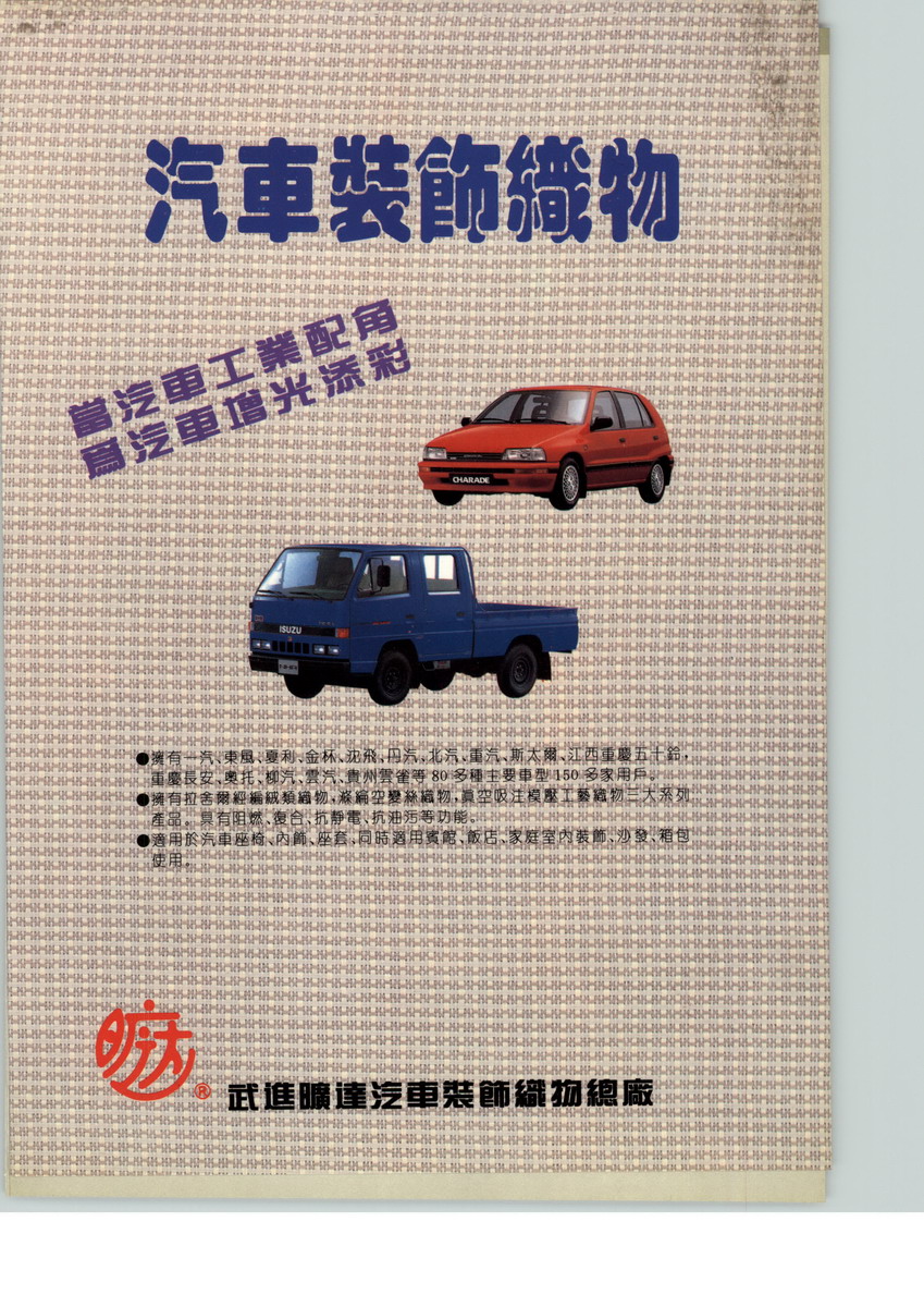 多年來,曠達(dá)以“甘當(dāng)汽車工業(yè)的配角,為汽車內(nèi)飾爭光添彩”為配套宗旨,以中國汽車零部件工業(yè)“高起點(diǎn)、大批量、專業(yè)化”為發(fā)展方針,不斷進(jìn)行技術(shù)改造,先后從德國、意大利、比利時(shí)、法國、美國、英國引進(jìn)世界先進(jìn)的織造、染整等設(shè)備200多臺套,形成年產(chǎn)各類汽車內(nèi)飾面料2000萬米的生產(chǎn)能力。產(chǎn)品有7大系列1500多個(gè)花式品種,已被國內(nèi)大部分汽車制造商廣泛應(yīng)用于座椅、車頂、車圍、門板等內(nèi)裝飾,目前主要配套廠商有:一汽、一汽大眾、上海大眾、東風(fēng)汽車、東南汽車、南京汽車、上汽奇瑞、浙江吉利、鄭州宇通、江玲汽車、廈門金龍、沈陽金杯、上汽通用五菱、哈飛汽車、昌河汽車等,國內(nèi)市場占有率38%以上?!皶邕_(dá)牌”汽車內(nèi)飾面料以色彩協(xié)調(diào)、抗靜電、抗油污、陰燃性、耐摩擦等顯著優(yōu)點(diǎn),曾先后榮獲農(nóng)業(yè)部科技進(jìn)步獎(jiǎng),中國鄉(xiāng)鎮(zhèn)企業(yè)局科技獎(jiǎng),創(chuàng)新基金項(xiàng)目,火炬計(jì)劃項(xiàng)目,中國專利博覽會(huì)金獎(jiǎng),江蘇省產(chǎn)品等,03年又被列入國家火炬計(jì)劃武進(jìn)新材料產(chǎn)業(yè)基地骨干企業(yè)。