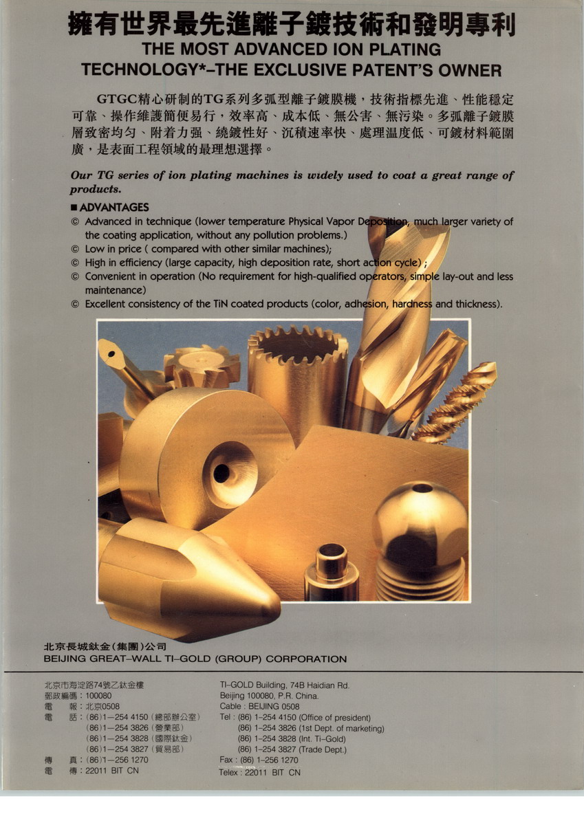 北京長城鈦金公司致力于鍍膜技術(shù)的研究與應(yīng)用,是中國首屈一指的物理蒸 氣沉著(PVD)鍍膜技術(shù)的科研成果開發(fā),設(shè)備制造和銷售中心。真空離子鍍膜的第 三代技術(shù),等離子體加速器型離子鍍膜法,是當今國際上最先進的表面工程技術(shù) 之一,也是復(fù)合材料領(lǐng)域里的一項高難課題。用此法得到的膜層,除具有細密均 勻,結(jié)合力強,超硬,耐磨,抗腐蝕,良好的導電性能和自潤滑性能等優(yōu)點,還 能提供豐富華麗的色彩。本公司生產(chǎn)的TG系列設(shè)備,可用來鍍單層或復(fù)合層 的TiN,ZrN,TiO,TiC,TiNC,TiAlN或稀貴金屬Au,Ag,Ta,Nb,Mo,W等裝飾 和功能涂膜。可用于鐘表,首飾,燈具,餐炊器具,五金工藝,玻璃,陶瓷,衛(wèi) 浴和建筑材料等類似產(chǎn)品的表面鍍膜,其特點是色彩豐富、品質(zhì)高貴。另一方面 ,鈦金功能鍍在工具,模具,重型機械,航空,航天,艦船,兵器和電子等領(lǐng)域 也有日益廣泛的應(yīng)用前景:硬質(zhì)的功能膜層不僅可以提高工件的使用壽命,而且 提高切削速度,表面光潔度和抗腐蝕性與耐磨性,大大地提高機械制造業(yè)的自動 化程度。作為同行業(yè)的龍頭,長城鈦金公司為適應(yīng)國際化的需要,又率先將 TG系列離子鍍膜設(shè)備提高到了國際水準:成為中國同行業(yè)里唯一的企業(yè),既達到 美國的UL標準,又獲得歐洲的CE證書 公司后續(xù)引進開發(fā)爆炸噴涂設(shè)備,歡迎到北京長城鈦金公司訪問考察!