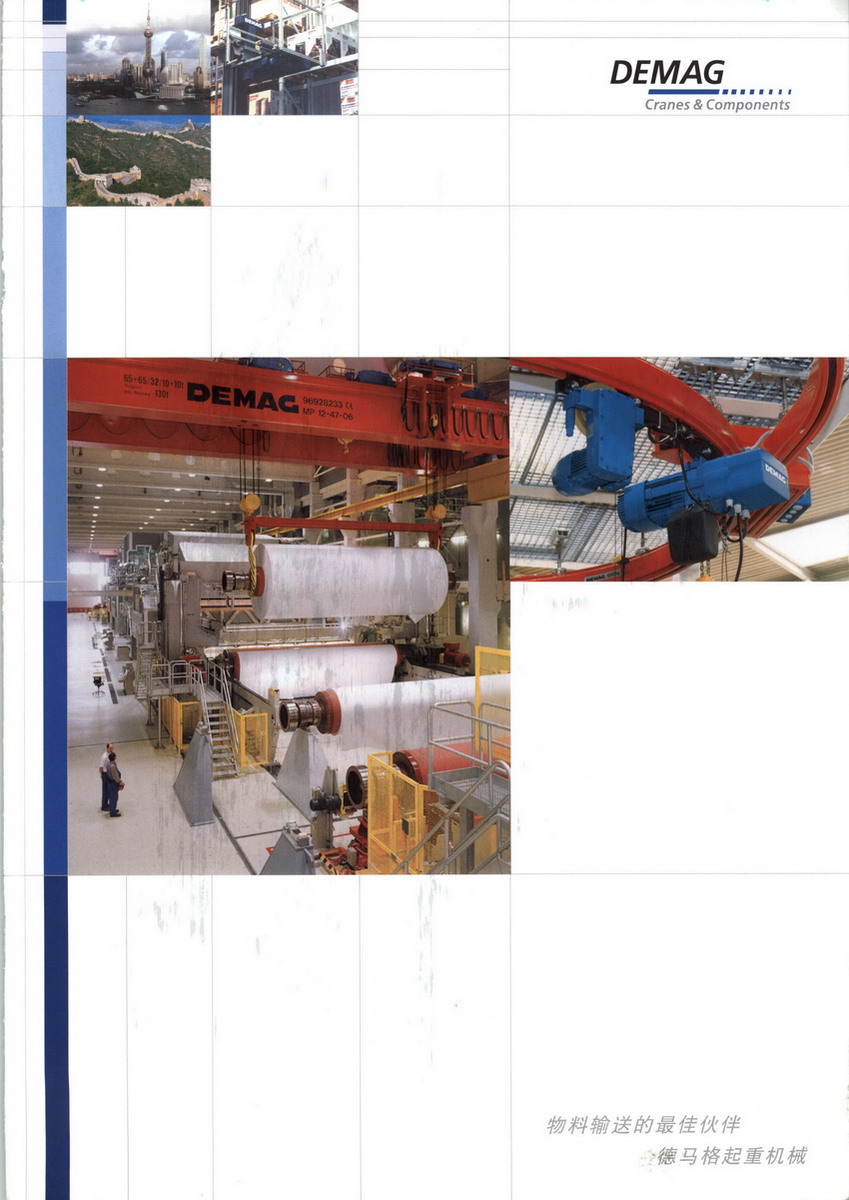 德馬格起重機械的歷史開始于1819年在魏特魯爾區(qū)的機械工廠。公司在1840年已經(jīng)開始生產(chǎn)橋式起重機,早日專注于生產(chǎn)起重機和起重機部件, 同時在1910年開始也包括了電驅(qū)動的提升設(shè)備。今天,德馬格起重機械是一個坐落在德國的全球性企業(yè),子公司和許多合作代理商遍布世界各地?;诋a(chǎn)品種類中的驅(qū)動產(chǎn)品,輕型起重機和標準起重機業(yè)務(wù),德馬格起重機械為小型工作坊到大型工業(yè)的各類公司提供物流,工業(yè)驅(qū)動產(chǎn)品的解決方案。 德馬格中國德馬格自1994年開始在中國開展業(yè)務(wù),經(jīng)過數(shù)十年努力,我們現(xiàn)在已在上海奉賢莊行歐洲工業(yè)園區(qū)建立了全新的現(xiàn)代化工廠。新工廠以全部產(chǎn)品本地化為原則,采用最先進的德馬格技術(shù)及工藝進行產(chǎn)品的生產(chǎn)、組裝、調(diào)試及安裝。這些起重機按照國際標準制造并符合國內(nèi)行業(yè)規(guī)定,具有恒定的高品質(zhì)。它們自重輕,起重能力強,能大大降低廠房的建造費用。我們的組件和設(shè)備的標準化程度極高、質(zhì)量穩(wěn)定、性能可靠。作為世界同行中的領(lǐng)先企業(yè),德馬格擁有最先進的技術(shù),極富創(chuàng)造力的工程師以及可靠的零配件供應(yīng),這一切優(yōu)勢均為產(chǎn)品的保養(yǎng)及售后服務(wù)提供了保障。設(shè)立在上海的生產(chǎn)基地同時還擁有系統(tǒng)化的立體倉庫,能夠在工業(yè)生產(chǎn)中保證高生產(chǎn)率和連續(xù)的供貨能力。德馬格產(chǎn)品種類豐富、應(yīng)用范圍廣,設(shè)有三個產(chǎn)品部門-標準起重機部門、輕型起重機部門、驅(qū)動產(chǎn)品部門。不論您需要的是驅(qū)動運行機構(gòu)或工位搬運裝置,還是生產(chǎn)線起重設(shè)備或倉庫儲運裝置,德馬格都能為您提供針對性的解決方案。在中國,德馬格起重機械公司已為各行各業(yè)的用戶提供了大量性能優(yōu)異的起重搬運設(shè)備,用戶滿意就是我們的動力來源。 德馬格起重機械(上海)有限公司不僅在上海設(shè)立有生產(chǎn)基地,同時在北京、天津、重慶、廣州、武漢等各大省市自治區(qū)設(shè)有辦事處。我們的銷售工程師不僅熟悉自己的產(chǎn)品,而且了解各行各業(yè)用戶在物料搬運方面的需求。他們愿來到您身邊為您提供咨詢并擬定最理想的解決方案。實現(xiàn)物料輸送技術(shù)現(xiàn)代化,對提高工業(yè)企業(yè)的生產(chǎn)競爭力至關(guān)重要,我們將幫助您加速這一進程。