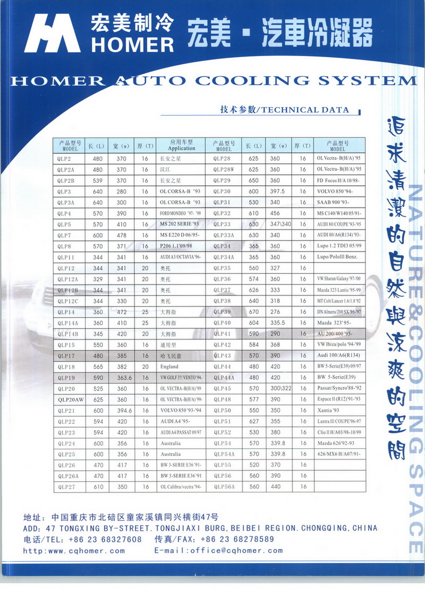 重慶宏美制冷設(shè)備有限公司始建于2001年,是一家高科技民營(yíng)企業(yè),目前旗下有重慶哈佛克沃汽車空調(diào)、重慶賀卡斯包裝廠、重慶屹東機(jī)械加工廠三家全資子公司,公司位于北碚區(qū)童家溪鎮(zhèn),占地2.67萬平方米,廠房2.5萬平方米;目前員工300余人,工程技術(shù)人員40余人。公司是國(guó)內(nèi)較早制造汽車鋁質(zhì)冷凝器、散熱器等的專業(yè)廠家之一。目前宏美制冷公司主要業(yè)務(wù)為:設(shè)計(jì)和制造汽車散熱器、冷凝器、暖風(fēng)機(jī)芯體、蒸發(fā)器、機(jī)油冷卻器、中冷器,摩托車水冷器、油冷器,漁船燈光冷卻系統(tǒng)、LED燈光冷卻系統(tǒng)等專業(yè)的鋁質(zhì)熱交換領(lǐng)域產(chǎn)品。哈佛克沃公司主要業(yè)務(wù)為:設(shè)計(jì)和制造汽車及電動(dòng)車駕駛倉(cāng)溫度管理系統(tǒng)、水溫油溫管理系統(tǒng)、電池組溫度管理系統(tǒng)。公司經(jīng)濟(jì)實(shí)力較強(qiáng),技術(shù)力量雄厚,設(shè)備精良,工藝先進(jìn),檢測(cè)手段齊全。公司擁有先進(jìn)的NOCOLOK連續(xù)隧道式氮?dú)獗Wo(hù)釬焊爐、翅片成型機(jī)、80噸高精度沖床、200噸高精度沖床,內(nèi)翅片成型機(jī),超聲波清洗機(jī)、全自動(dòng)裝芯單元、半自動(dòng)裝配機(jī)、氦質(zhì)譜檢漏儀等專業(yè)制造設(shè)備。建立了多條可以生產(chǎn)管帶式、層疊式、平行流式等各種類型熱交換器的柔性生產(chǎn)線,具有年產(chǎn)各類汽車空調(diào)蒸發(fā)器、冷凝器、散熱器、中冷器、暖風(fēng)機(jī)芯、摩托車油冷卻器、散熱器等各類鋁制熱交換器200萬臺(tái)的生產(chǎn)能力。公司注重技術(shù)隊(duì)伍和開發(fā)能力的建設(shè),從全國(guó)各地聘請(qǐng)了多名有豐富經(jīng)驗(yàn)的技術(shù)專家和高級(jí)技師,從高校招收了一批年輕的大學(xué)畢業(yè)生,形成了一只技術(shù)經(jīng)驗(yàn)豐富、層次結(jié)構(gòu)合理、勇于開拓創(chuàng)新、富有活力的研發(fā)隊(duì)伍,其中博士學(xué)位兩名,本科占80%以上,并與重慶大學(xué)材料科學(xué)與工程學(xué)院合作,成為“校企產(chǎn)學(xué)研究基地”。公司十分重視質(zhì)量管理,在2009時(shí)完成了ISO/TS16949第三方認(rèn)證。建立了專職的質(zhì)量管理隊(duì)伍,配備了生產(chǎn)開發(fā)所必須的檢測(cè)儀器設(shè)備,有豐富質(zhì)量管理經(jīng)驗(yàn)的專業(yè)管理人員,在全公司內(nèi)按TS標(biāo)準(zhǔn)要求建立、完善質(zhì)量保證體系,使公司的開發(fā)、生產(chǎn)活動(dòng)全部處于受控之中,為生產(chǎn)優(yōu)質(zhì)產(chǎn)品提供可靠的保證。公司完成了實(shí)驗(yàn)室的三期投資,擁有汽車空調(diào)性能試驗(yàn)臺(tái)、水箱暖風(fēng)性能試驗(yàn)臺(tái)、震動(dòng)試驗(yàn)臺(tái)、壓力脈沖試驗(yàn)臺(tái)、噪音測(cè)試室、高低溫實(shí)驗(yàn)箱、鹽霧實(shí)驗(yàn)箱等各類試驗(yàn)設(shè)備。公司經(jīng)過15年高速發(fā)展,目前已經(jīng)擁有近兩千款產(chǎn)品,客戶遍布?xì)W洲、美國(guó)、中東、澳大利亞、新加坡、臺(tái)灣等國(guó)家和地區(qū)。直接配套或二級(jí)配套長(zhǎng)安、長(zhǎng)安鈴木、長(zhǎng)安跨越、北汽銀翔、華晨鑫源、力帆汽車、東風(fēng)小康、四川現(xiàn)代、廣汽吉奧等十余家主機(jī)廠。重慶賀卡斯包裝公司,能夠設(shè)計(jì)制造各類重型、輕型包裝箱及輔助材料和托盤,公司擁有空箱抗壓測(cè)定儀、鼓風(fēng)恒熱干燥箱、耐破度測(cè)定儀、抗壓縮測(cè)定儀、耐折度測(cè)定儀、戳穿強(qiáng)度測(cè)定儀、抗裂斷測(cè)定儀等專業(yè)設(shè)備。公司愿以精良的產(chǎn)品、優(yōu)惠的價(jià)格、及時(shí)的供貨、周到的服務(wù)與中外朋友建立良好的合作的關(guān)系,歡迎全球的朋友咨詢、到訪!