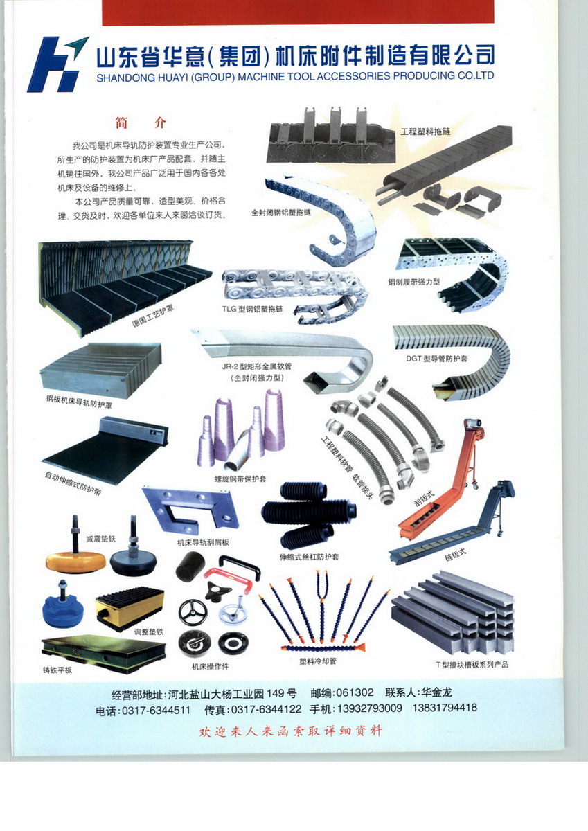 山東省華意(集團(tuán))機(jī)床附件制造有限公司始于1975年,位于山東北部,緊靠205國道,交通便利。我公司長期致力于數(shù)控機(jī)床附件的研制、開發(fā)、生產(chǎn)和銷售。主要生產(chǎn)工程塑料拖鏈、鋼鋁拖鏈、工程塑料軟管、軟管接頭、電纜防水接頭、防護(hù)罩等數(shù)控機(jī)床附件產(chǎn)品,現(xiàn)已成為國內(nèi)生產(chǎn)機(jī)床附件數(shù)量最大、品種最多、規(guī)格最全的企業(yè)?!?進(jìn)入21世紀(jì)以來,我公司正式成為中外合資企業(yè),注冊資金1000萬元,占地6萬平方米,固定資產(chǎn)總值三千多萬元,現(xiàn)有員工263人,其中本科32人、大專以上學(xué)歷和高技術(shù)職稱86人,公司一貫倡導(dǎo)科技為先、研發(fā)領(lǐng)路的經(jīng)營思想,以創(chuàng)造市場引導(dǎo)市場為原則。 公司承諾:我公司對(duì)產(chǎn)品的預(yù)研,設(shè)計(jì),開發(fā),測試,維護(hù)各個(gè)環(huán)節(jié)進(jìn)行全面質(zhì)量管理,最終目標(biāo)是開發(fā),銷售與支持各項(xiàng)質(zhì)量產(chǎn)品。放眼未來,華意公司將繼續(xù)奉行誠信、創(chuàng)新的企業(yè)理念,不斷追求更好、更高,使華意產(chǎn)品成為千千萬萬用戶的首選品牌,竭誠歡迎各 界朋友光臨指導(dǎo)!